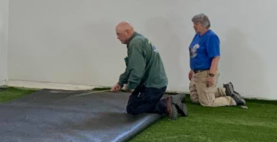 Kate found a companion dog lover in Colorado, Donna Tessier, and they created a purpose-built canine training center together. Situated in the Grand Junction / Fruita area, Western Slope Canines, LLC provides top-notch dog training (at westernslopecanines.com and westernslopesearchdogs.org). Kate was involved in the whole process, here supervising the artificial turf installer.